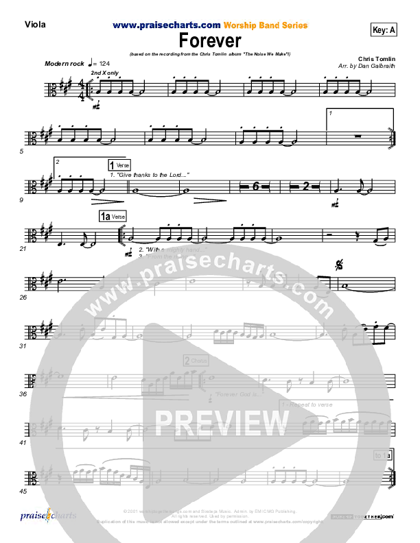 Download the Viola sheet music for Forever by Chris Tomlin, from the album The Noise We Make. This song was arranged by Daniel Galbraith in the key of A, G.