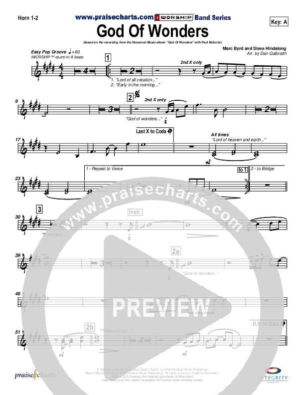 Download the Orchestration brass parts for God Of Wonders by Paul Baloche, from the album God Of Wonders. This song was arranged by Daniel Galbraith in the key of A, Ab, Bb, G.