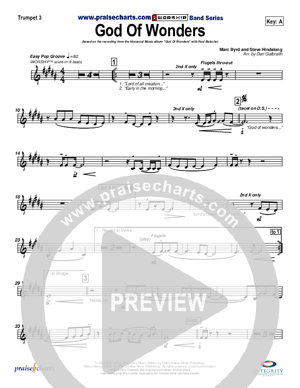 Download the Trumpet 3 sheet music for God Of Wonders by Paul Baloche, from the album God Of Wonders. This song was arranged by Daniel Galbraith in the key of A, Ab, Bb, G.