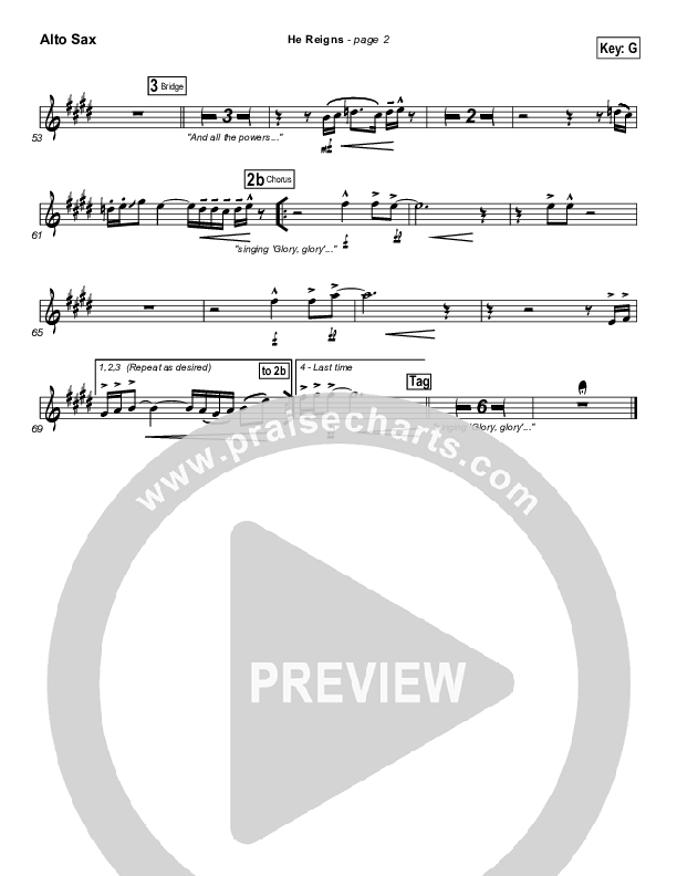 Download the AltoSax sheet music for He Reigns by Newsboys, from the album Adoration. This song was arranged by Daniel Galbraith in the key of F, G.
