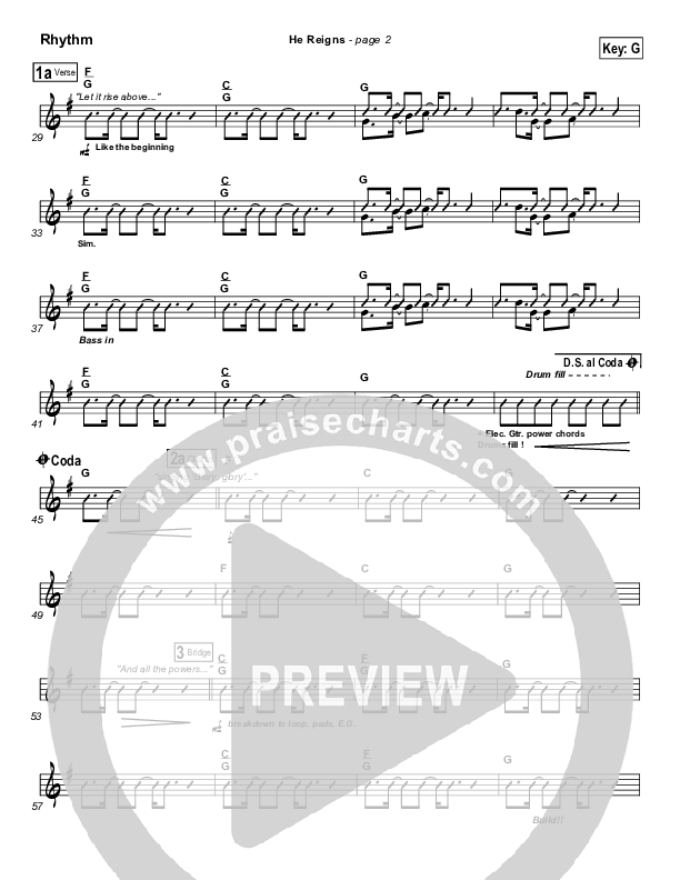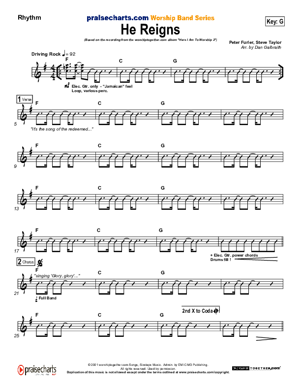 Download the Rhythm Chart for He Reigns by Newsboys, from the album Adoration. This song was arranged by Daniel Galbraith in the key of F, G.