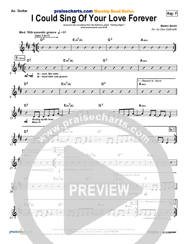 Download the Rhythm Chart for I Could Sing Of Your Love Forever by Delirious / Passion, from the album Cutting Edge. This song was arranged by Daniel Galbraith in the key of E, F.