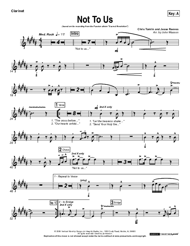 Download the Orchestration for Not To Us by Chris Tomlin / Passion, from the album Sacred Revolution. This song was arranged by John Wasson in the key of A, B, Bb.
