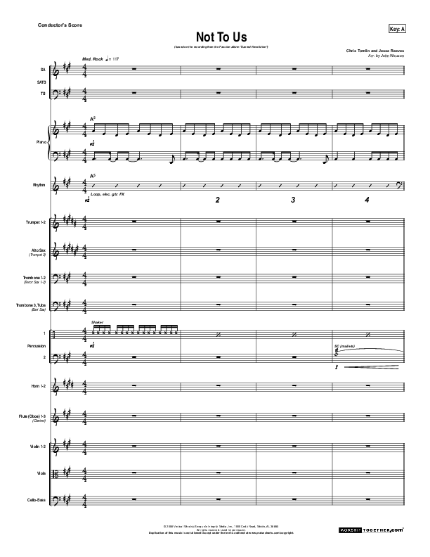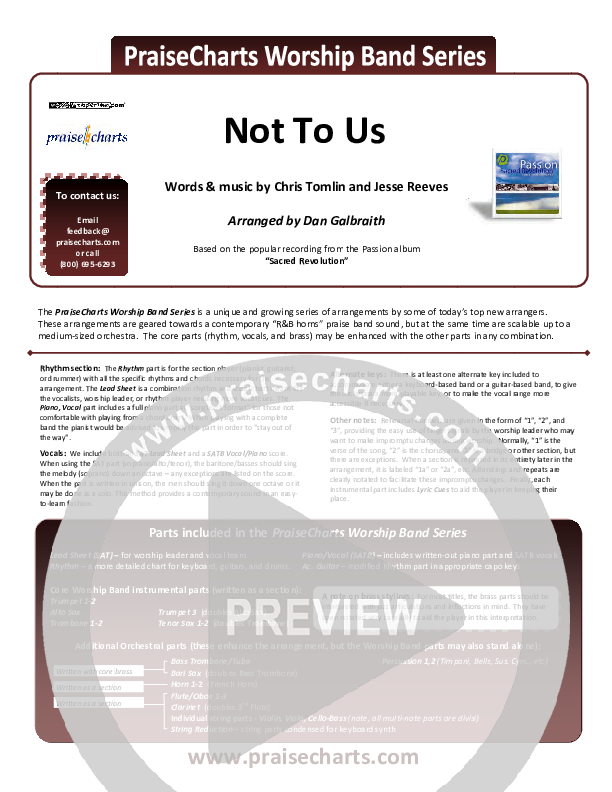 Download the Orchestration for Not To Us by Chris Tomlin / Passion, from the album Sacred Revolution. This song was arranged by John Wasson in the key of A, B, Bb.