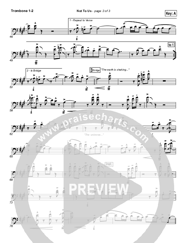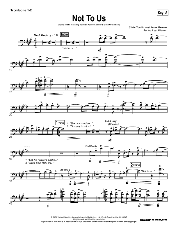 Download the Trombone 1,2 sheet music for Not To Us by Chris Tomlin / Passion, from the album Sacred Revolution. This song was arranged by John Wasson in the key of A, B, Bb.