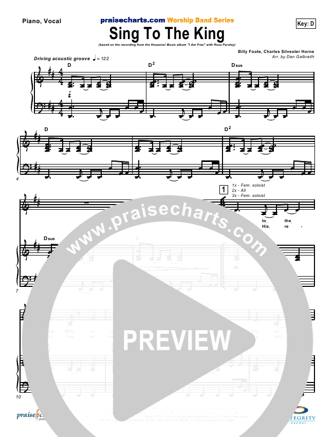 Download the Orchestration for Sing To The King by New Life Worship, from the album Ross Parsley: I Am Free. This song was arranged by Daniel Galbraith in the key of D, Eb.
