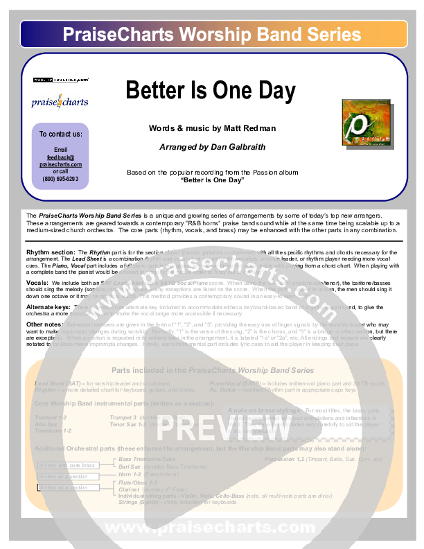 Download the Orchestration for Better Is One Day by Matt Redman, from the album Passion: Better Is One Day. This song was arranged by Daniel Galbraith in the key of E, F.