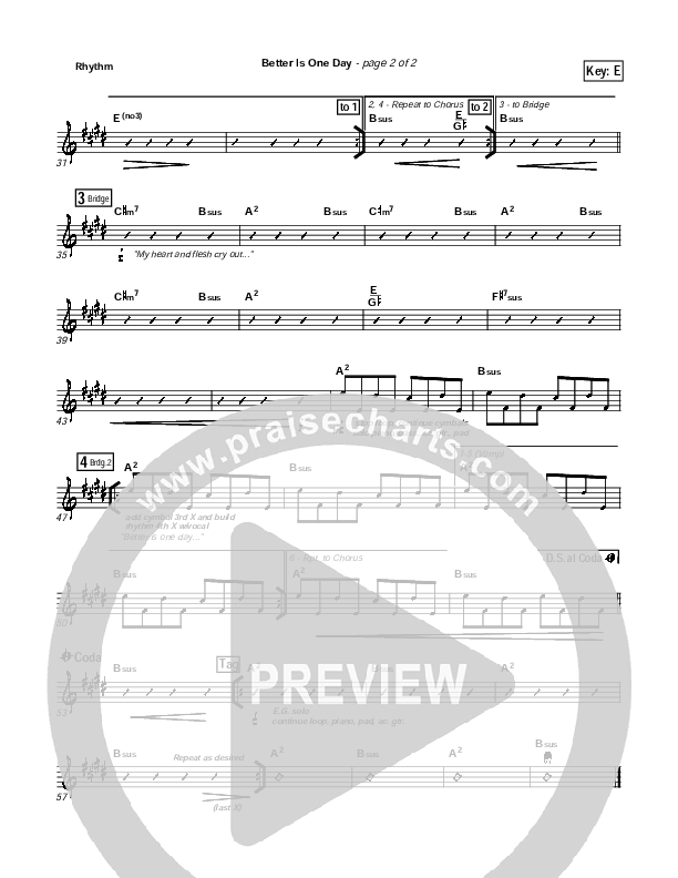 Download the Rhythm Chart for Better Is One Day by Matt Redman, from the album Passion: Better Is One Day. This song was arranged by Daniel Galbraith in the key of E, F.
