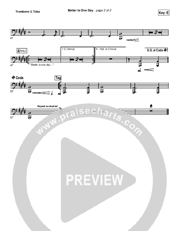 Download the Trombone 3/Tuba sheet music for Better Is One Day by Matt Redman, from the album Passion: Better Is One Day. This song was arranged by Daniel Galbraith in the key of E, F.