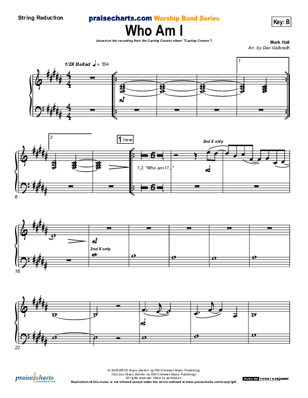 Download the Orchestration for Who Am I by Casting Crowns, from the album Casting Crowns. This song was arranged by Daniel Galbraith in the key of Ab, B, Bb.