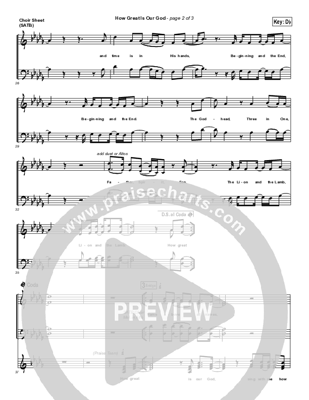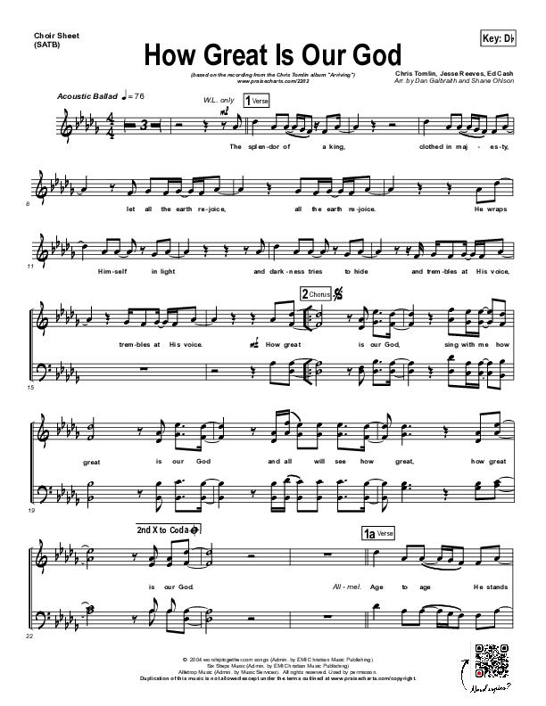 Download the Choir Sheet for How Great Is Our God by Chris Tomlin, from the album Arriving. This song was arranged by Daniel Galbraith in the key of A, Bb, C, Db.
