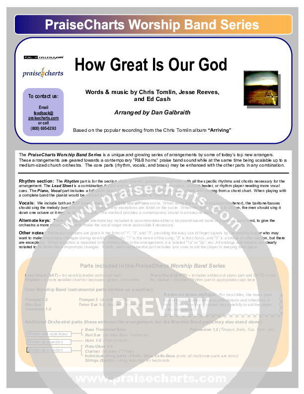 Download the Orchestration for How Great Is Our God by Chris Tomlin, from the album Arriving. This song was arranged by Daniel Galbraith in the key of A, Bb, C, Db.