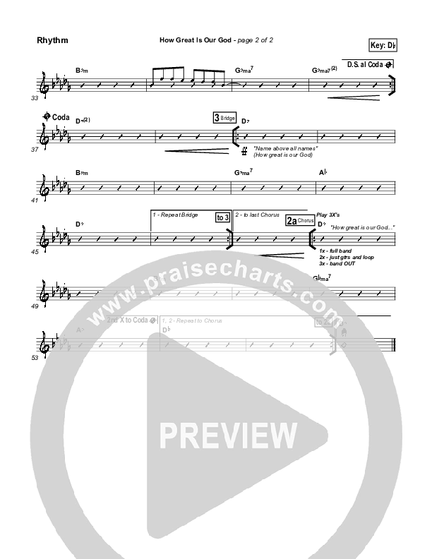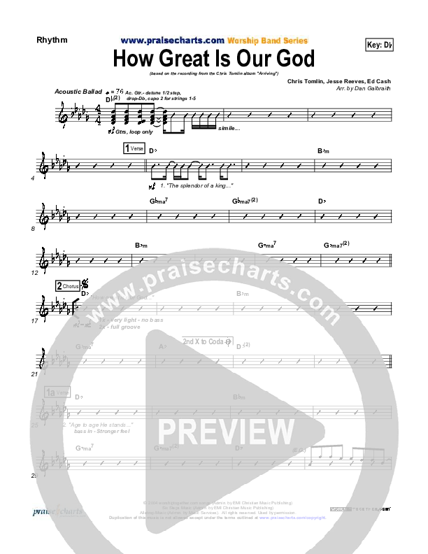 Download the Rhythm Chart for How Great Is Our God by Chris Tomlin, from the album Arriving. This song was arranged by Daniel Galbraith in the key of A, Bb, C, Db.
