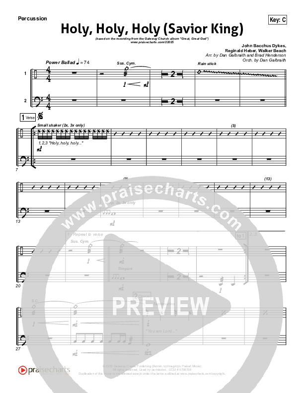 Download the percussion sheet music for Holy Holy Holy (Savior King) by Gateway Worship, from the album Great Great God. This song was arranged by Daniel Galbraith / Brad Henderson in the key of Bb, C.
