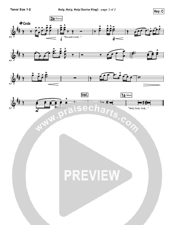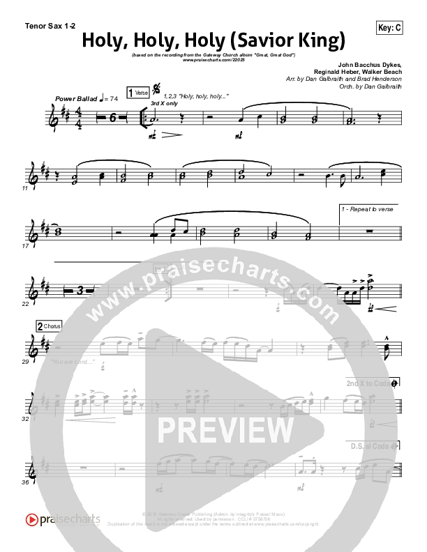 Download the Tenor Sax sheet music for Holy Holy Holy (Savior King) by Gateway Worship, from the album Great Great God. This song was arranged by Daniel Galbraith / Brad Henderson in the key of Bb, C.
