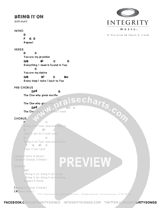 Download the PDF Chord Charts for Bring It On by Planetshakers, from the album Nothing Is Impossible. This song was arranged by Integrity Music in the key of .