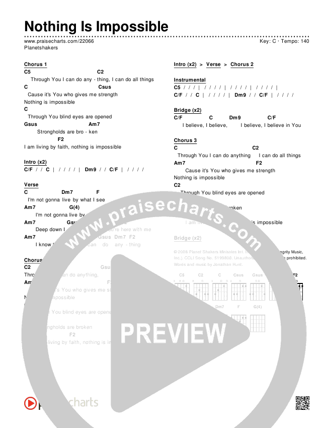 Download the PDF Chord Charts for Nothing Is Impossible by Planetshakers, from the album Nothing Is Impossible. This song was arranged by Joel Mott in the key of Bb, C.