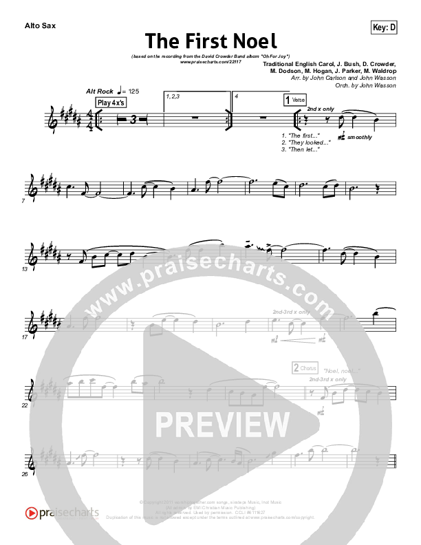 Download the AltoSax sheet music for The First Noel by David Crowder, from the album WOW Christmas Silver. This song was arranged by John Carlson / John Wasson in the key of C, D.