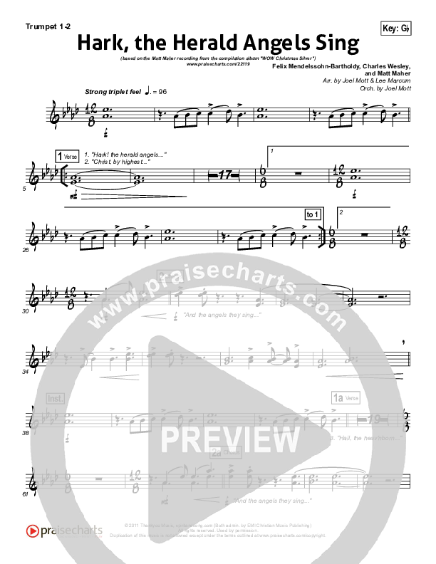 Download the trumpet sheet music for Hark The Herald Angels Sing by Matt Maher, from the album WOW Christmas Silver. This song was arranged by Joel Mott / Lee Marcum in the key of F, Gb.