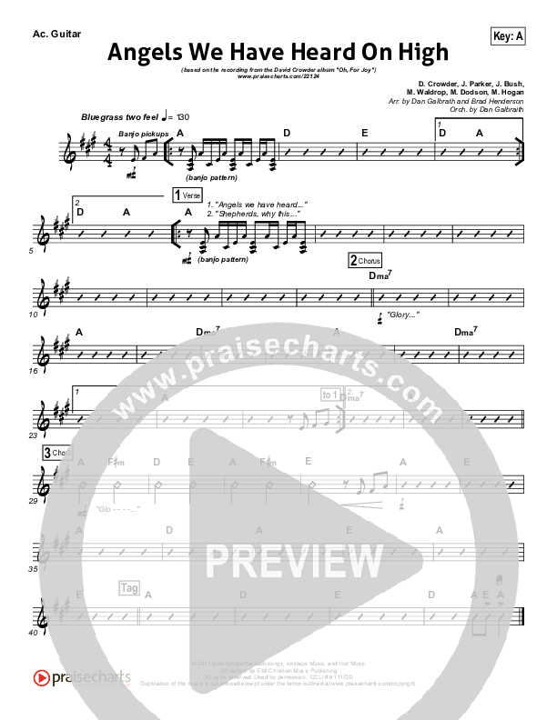 Download the Acoustic Guitar sheet music for Angels We Have Heard On High by David Crowder, from the album Oh For Joy. This song was arranged by Daniel Galbraith / Brad Henderson in the key of A, G.