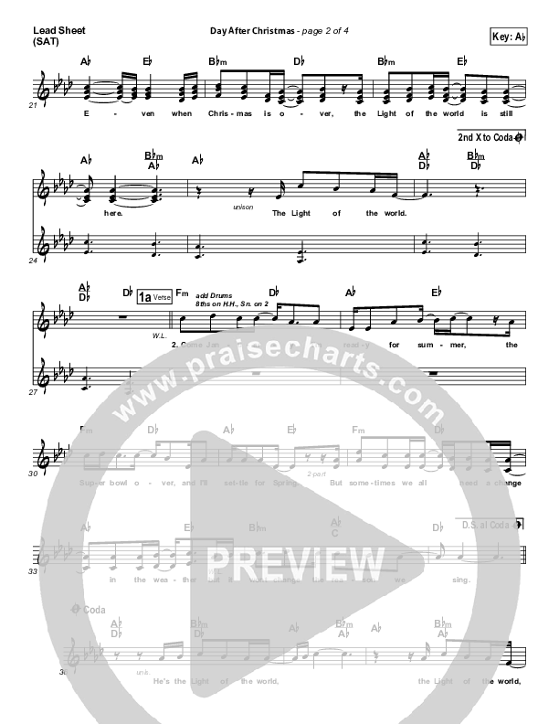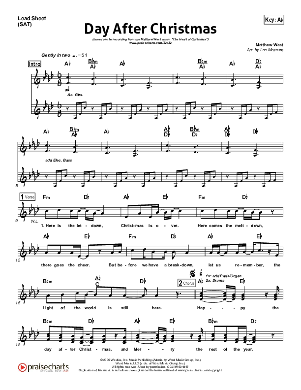 Download the sheet music for Day After Christmas by Matthew West, from the album The Heart Of Christmas. This song was arranged by Lee Marcum in the key of A, Ab.