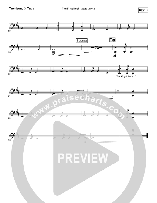 Download the Trombone 3/Tuba sheet music for The First Noel by Phil Wickham, from the album Songs For Christmas. This song was arranged by Daniel Galbraith / Brad Henderson in the key of C, D.