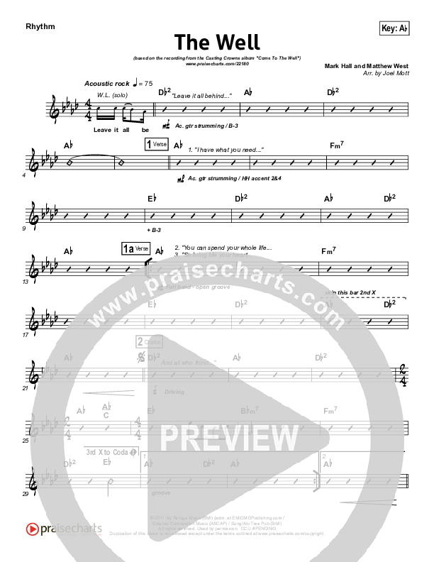 Download the Rhythm Chart for The Well by Casting Crowns, from the album Come To The Well. This song was arranged by Joel Mott in the key of Ab, G.