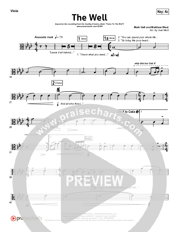 Download the Viola sheet music for The Well by Casting Crowns, from the album Come To The Well. This song was arranged by Joel Mott in the key of Ab, G.