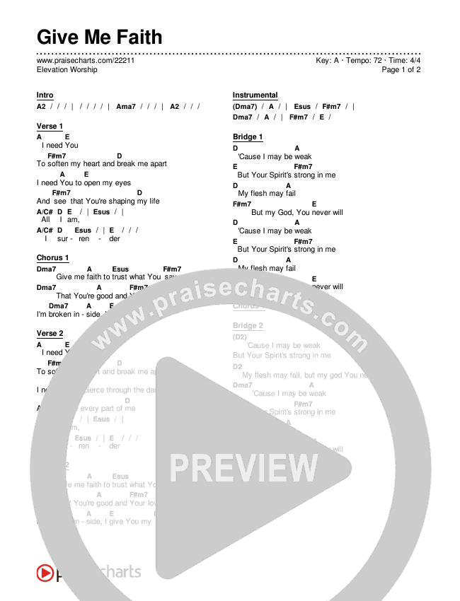 Download the PDF Chord Charts for Give Me Faith by Elevation Worship, from the album For The Honor. This song was arranged by Joel Mott / Jared Haschek in the key of A, F, G.