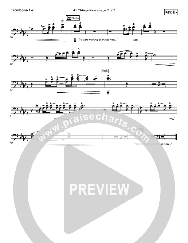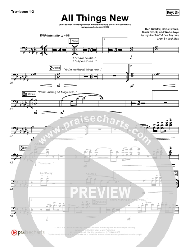 Download the Trombone 1,2 sheet music for All Things New by Elevation Worship, from the album For The Honor. This song was arranged by Joel Mott / Lee Marcum in the key of C, Db.