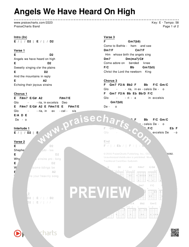 Download the PDF Chord Charts for Angels We Have Heard On High by PraiseCharts Band / Arr. Daniel Galbraith, from the album PraiseCarols (Vol. 1). This song was arranged by Daniel Galbraith in the key of E, F.