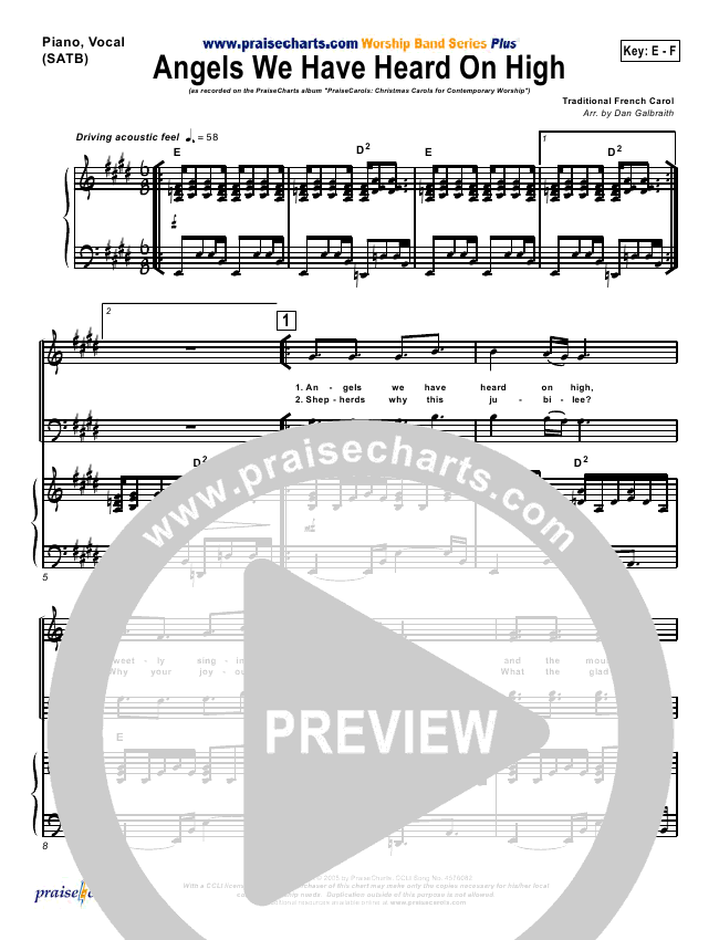 Download the Orchestration for Angels We Have Heard On High by PraiseCharts Band / Arr. Daniel Galbraith, from the album PraiseCarols (Vol. 1). This song was arranged by Daniel Galbraith in the key of E, F.