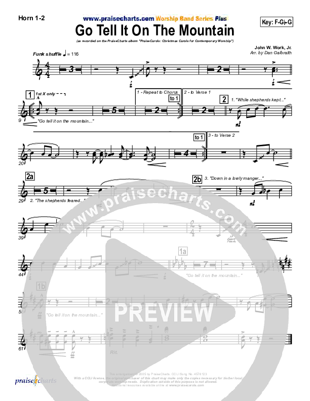 Download the Orchestration brass parts for Go Tell It On The Mountain by PraiseCharts Band / Arr. Daniel Galbraith, from the album PraiseCarols (Vol. 1). This song was arranged by Daniel Galbraith in the key of Eb, F.