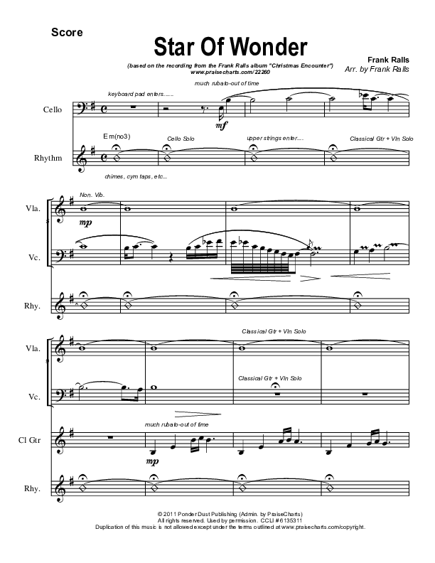 Download the Orchestration for Star Of Wonder by Frank Ralls, from the album Christmas Encounter. This song was arranged by Frank Ralls in the key of G.