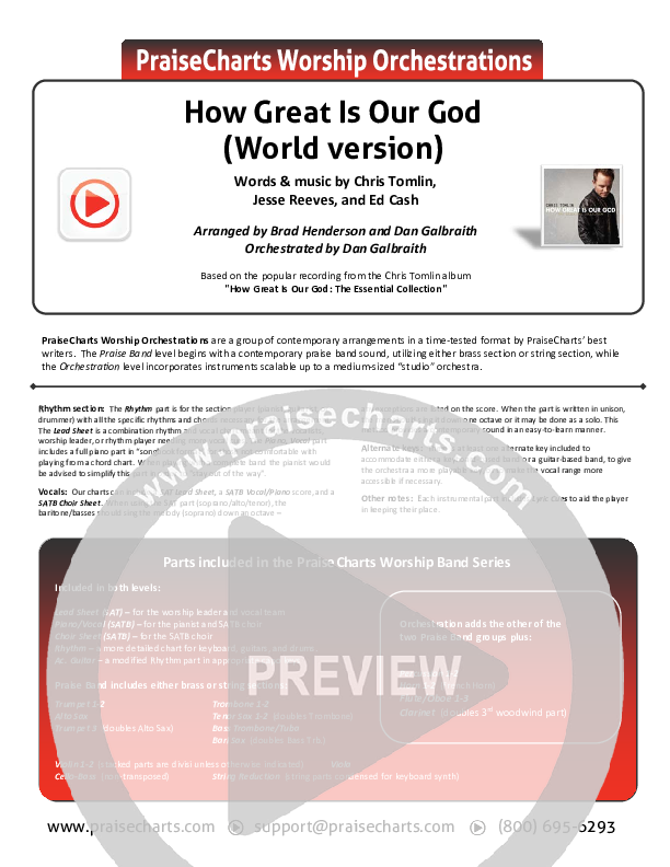 Download the Orchestration for How Great Is Our God (World Edition) by Chris Tomlin, from the album How Great Is Our God: The Essential Collection. This song was arranged by Daniel Galbraith / Brad Henderson in the key of C, Db.
