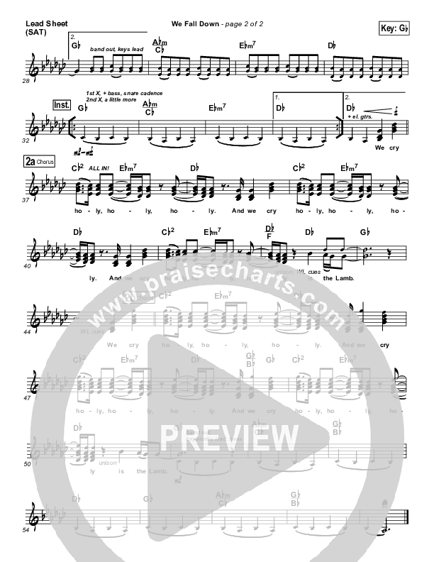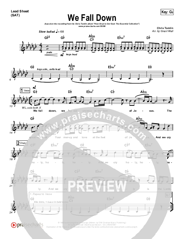 Download the sheet music for We Fall Down by Chris Tomlin, from the album How Great Is Our God: The Essential Collection. This song was arranged by Brad Henderson in the key of G, Gb.