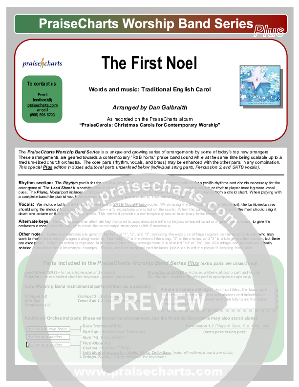 Download the Orchestration for The First Noel by PraiseCharts Band / Arr. Daniel Galbraith, from the album PraiseCarols (Vol. 1). This song was arranged by Daniel Galbraith in the key of Bb, C.