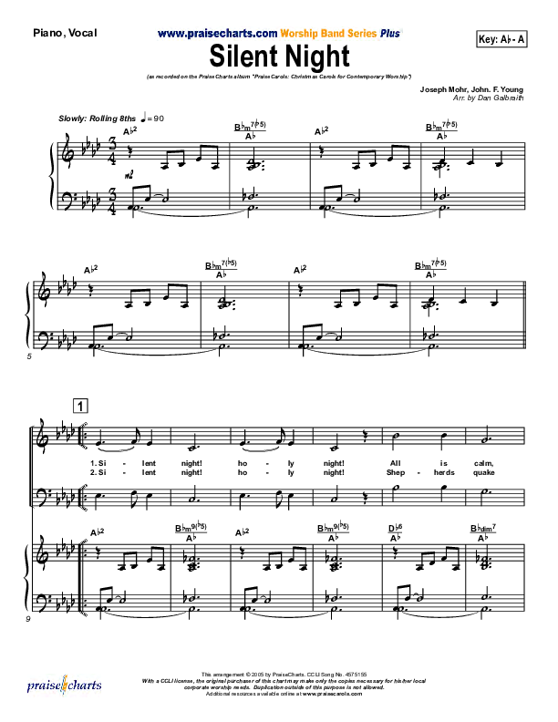 Download the sheet music for Silent Night by PraiseCharts Band / Arr. Daniel Galbraith, from the album PraiseCarols (Vol. 1). This song was arranged by Daniel Galbraith in the key of Ab, G.