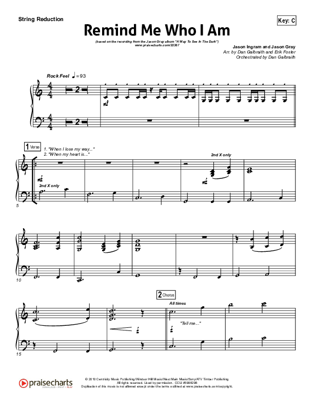 Download the Orchestration string parts for Remind Me Who I Am by Jason Gray, from the album A Way To See In The Dark. This song was arranged by Daniel Galbraith / Erik Foster in the key of C, D.