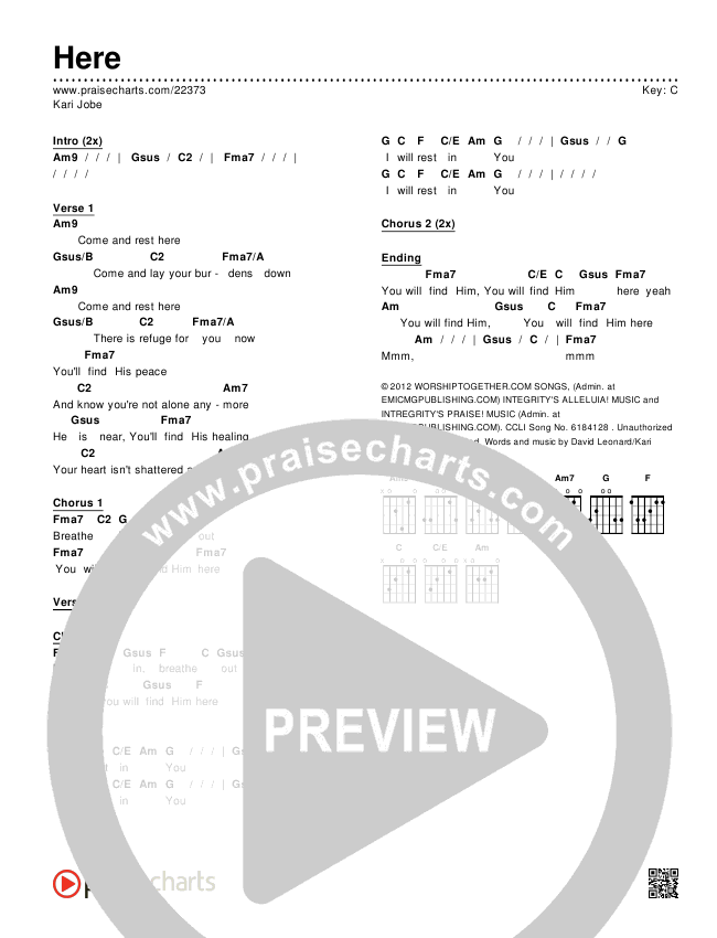 Download the PDF Chord Charts for Here by Kari Jobe, from the album Where I Find You. This song was arranged by Joel Mott / Brad Henderson in the key of C, D.