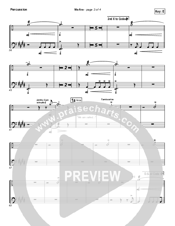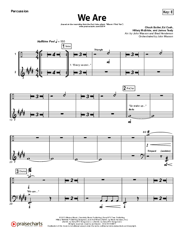 Download the percussion sheet music for We Are by Kari Jobe, from the album Where I Find You. This song was arranged by Joel Mott / Brad Henderson in the key of E, F, G.