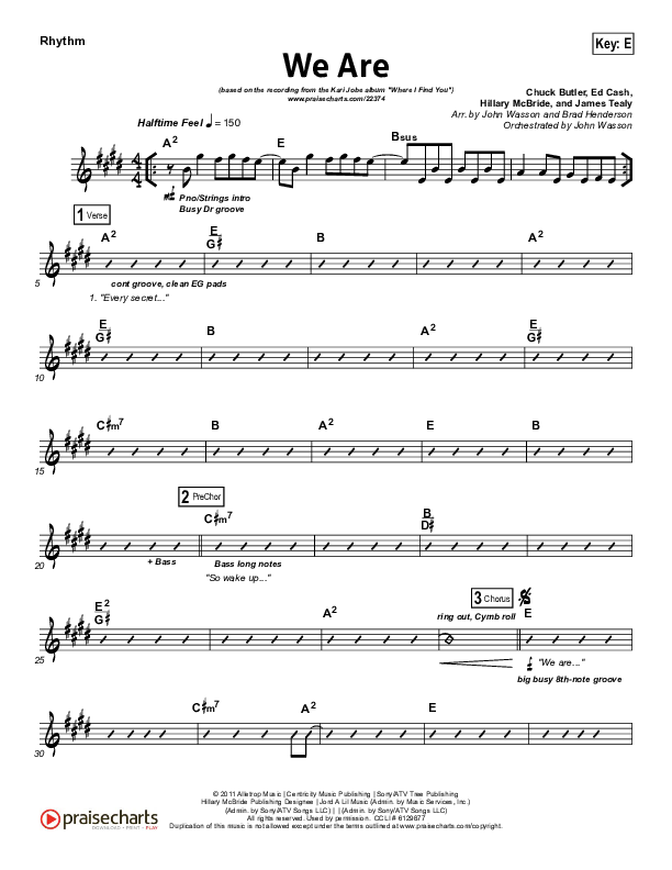Download the Rhythm Chart for We Are by Kari Jobe, from the album Where I Find You. This song was arranged by Joel Mott / Brad Henderson in the key of E, F, G.