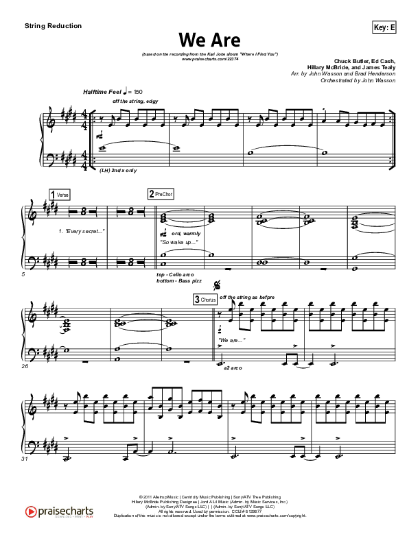 Download the Orchestration string parts for We Are by Kari Jobe, from the album Where I Find You. This song was arranged by Joel Mott / Brad Henderson in the key of E, F, G.
