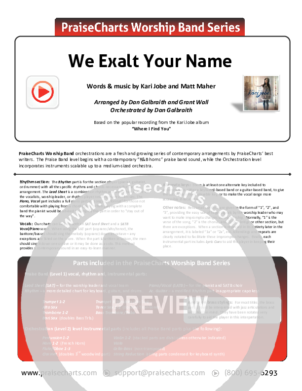 Download the Orchestration for We Exalt Your Name by Kari Jobe / Matt Maher, from the album Where I Find You. This song was arranged by Daniel Galbraith / Grant Wall in the key of D, Db.
