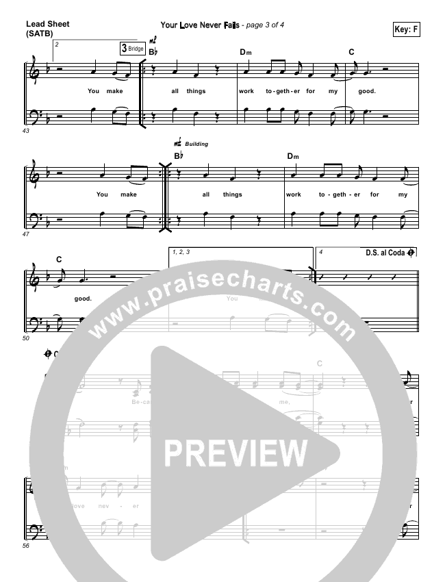 Download the sheet music for Your Love Never Fails by Don Moen, from the album Uncharted Territory. This song was arranged by Jared Haschek in the key of F.