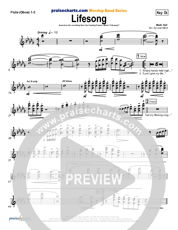 Download the Flute/Oboe sheet music for Lifesong by Casting Crowns, from the album Lifesong. This song was arranged by Joel Mott in the key of Bb, Db.