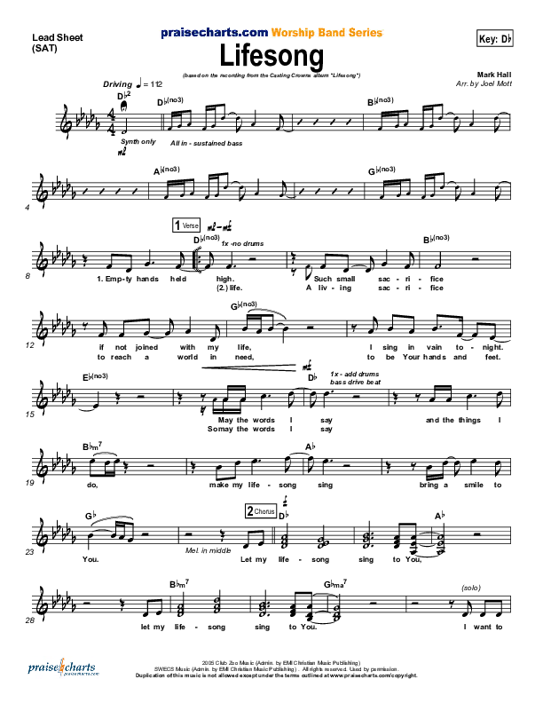 Download the Orchestration for Lifesong by Casting Crowns, from the album Lifesong. This song was arranged by Joel Mott in the key of Bb, Db.