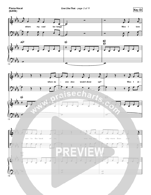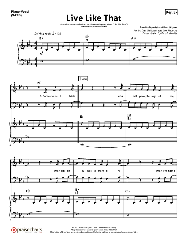 Download the sheet music for Live Like That by Sidewalk Prophets, from the album Live Like That. This song was arranged by Daniel Galbraith / Lee Marcum in the key of E, Eb.