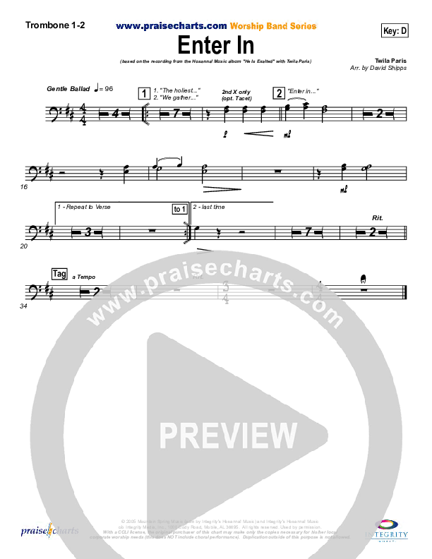 Download the Trombone 1,2 sheet music for Enter In by Twila Paris, from the album He Is Exalted. This song was arranged by David Shipps in the key of D.