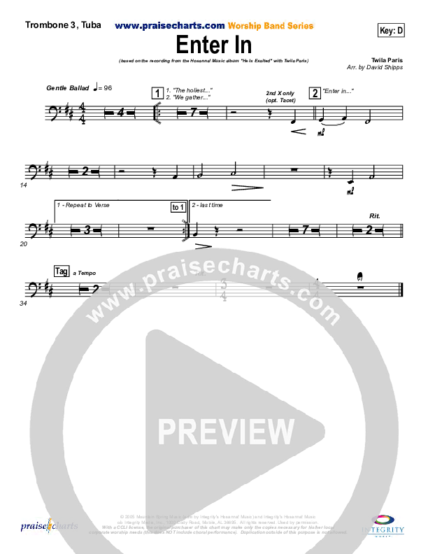 Download the Trombone 3/Tuba sheet music for Enter In by Twila Paris, from the album He Is Exalted. This song was arranged by David Shipps in the key of D.